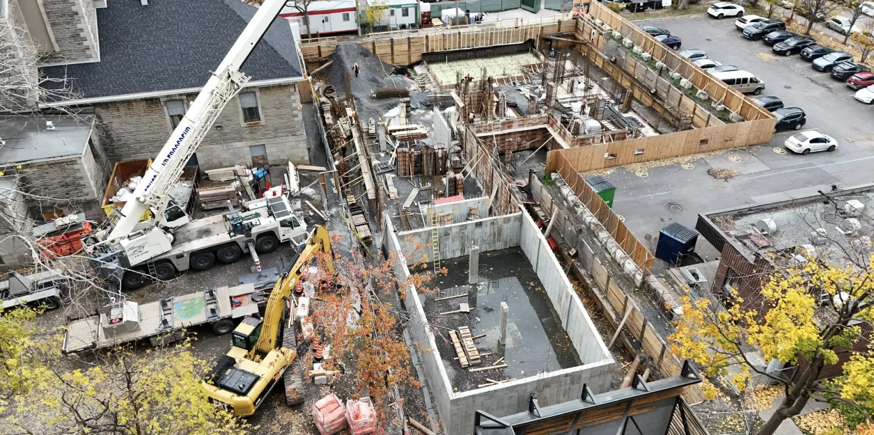 La décontamination du terrain a marqué le coup d’envoi des travaux. Avec l’excavation de près de 6000 tonnes de sols, le terrain a ainsi été préparé pour le moment déterminant du chantier : la coulée de béton du 19 septembre, qui symbolise la naissance du bâtiment. Depuis cette date, le chantier a progressé énormément, avec la coulée de fondations et certains murs du sous-sol.